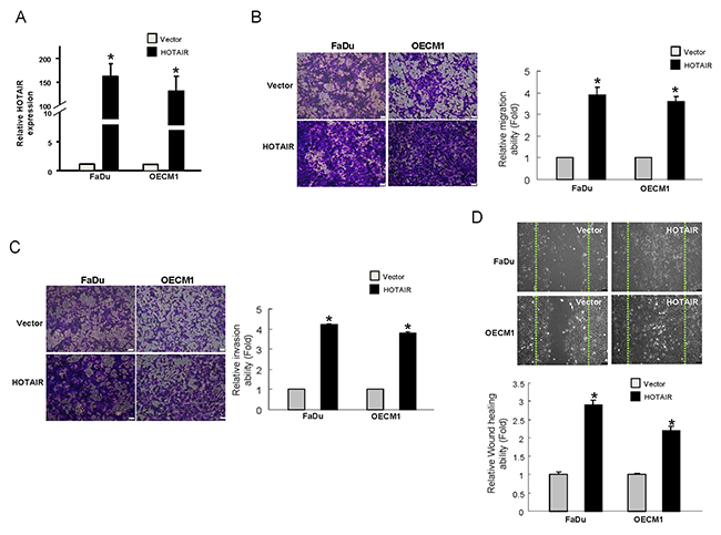 Since HOTAIR seemed to be implicated in tumor progression, we chose the OSCC with low level of HOTAIR, FaDu and OECM-1, to generate stable HOTAIR-overexpressing cells through lentiviral-mediated transduction in order to verify this hypothesis. As shown in Figure 4A, both HOTAIR-overexpressing OSCC cell lines displayed elevated level of HOTAIR. Next, we evaluated the invasiveness of these HOTAIR-overexpressing OSCC cells. As expected, the upregulated HOTAIR increased their capacities to migrate (Figure 4B) and invade (Figure 4C) as well as enhanced the wound healing ability (Figure 4D).