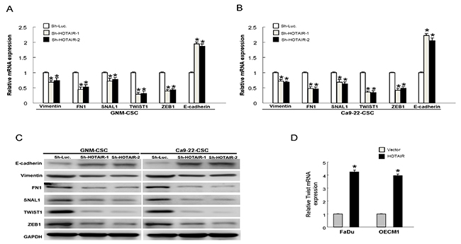 Figure 5: Expression of HOTAIR promotes the EMT characteristics The gene expression of the mesenchymal markers, including vimentin, FN1, Snail, Twist and ZEB1, were reduced and epithelial marker E-cadherin was increased following down-regulation of HOTAIR in GNM-CSCs (A) and Ca9-22-CSCs (B); The similar changes of protein expression were observed in OSCC-CSCs (C); (D) The expression of Twist was enhanced in HOTAIR-overexpression OSCCs. Data shown as mean ± SD of three independent experiments.