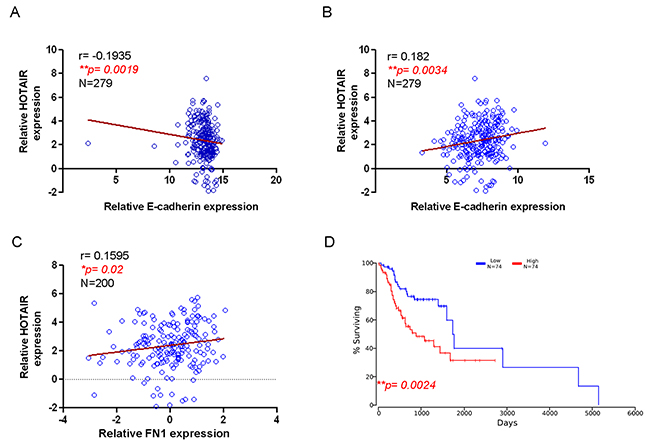 Figure 6: Correlation of HOTAIR with EMT markers and survival rate of OSCC patients HOTAIR negatively correlated with epithelial marker E-cadherin (A) but positively associated with mesenchymal markers, including Twist (B) and FN1 (C). Kaplan-Meier survival analysis of OSCC patients from The Cancer Genome Atlas (TCGA) database demonstrated that higher HOTAIR expression led to poor survival (D) using Pearson’s correlation coefficient.