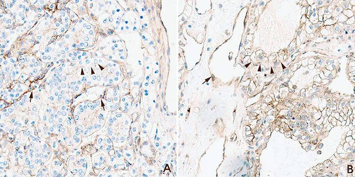 Figure 1: Examples of myoferlin staining grades. (A) Myoferlin hypoexpression. Clear cell renal cell carcinoma (ccRCC) cells revealed weaker expression compared with capillary endothelial cells (arrow, endothelial cells; arrow head, ccRCC cells; Magnification x200). (B) Myoferlin hyperexpression. Clear cell renal cell carcinoma (ccRCC) cells exhibited stronger expression compared with capillary endothelial cells (arrow, endothelial cells; arrow head, ccRCC cells; Magnification x200).