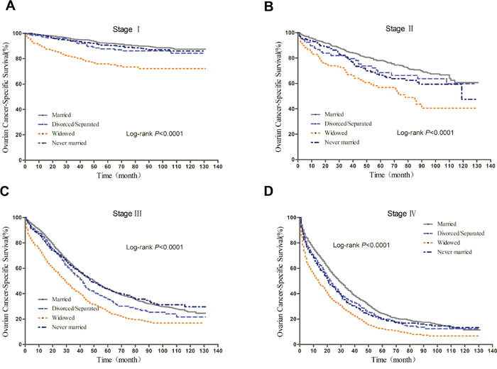After adjusting for other covariates in Cox regression, patients with different marital status at stage IV showed similar risk of all-cause mortality; widowed patients had greater all-cause mortality risk than married ones at stage I, II, and III; divorced/separated showed prognostic disadvantage at stage I and III, while never married patients only at stage II. For EOC-specific survival, never married patients had poorer prognosis at stage II and IV; widowed patients showed disadvantage at stage I and III; while divorced/separated had greater cancer-specific mortality risk at stage III.