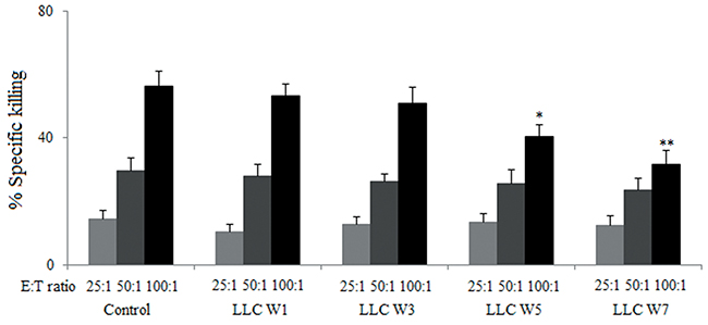Figure 1: The cytotoxicity of splenic lymphocytes were inhibited by tumor cells. Splenic lymphocytes were incubated with LLC cells (2×105/well) at different effector/target ratios (25:1, 50:1 and 100:1) in the 96-well culture plates for 4 h. The supernatants were collected and the absorbance at 490 nm was tested to evaluate the lactate dehydrogenase (LDH). Control (Tumor-free mice, n=10), LLC W1, 3, 5 and 7 (1, 3, 5 and 7 weeks after LLC inoculation, n=10/group). The results are shown as the means ± SD of three different experiments. *P<0.05, **P<0.01 versus Control.