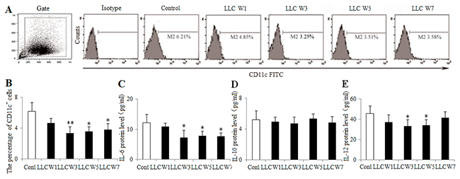 Figure 3: Changes in the DC function during the progression of lung cancer. Single cell suspensions from tumor tissues were stained with CD11c+ antibody. The percentage of DCs (A) was analyzed by flow cytometry. The percentage of DCs (B) was shown in the histogram. The protein levels of IL-6 (C), IL-10 (D) and IL-12 (E) were measured by ELISA using the homogenate of tumor tissues. Control (Tumor-free mice, n=10), LLC W1, 3, 5 and 7 (1, 3, 5 and 7 weeks after LLC inoculation, n=10/group). The results are shown as the means ± SD of three different experiments. *P<0.05, **P<0.01 versus Control.