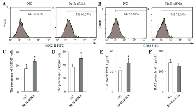 Figure 6: Knockdown of Pir-B by specific siRNA increased the DC function. DCs isolated from spleen of 5-week tumor-bearing mice were transfected with either negative control (NC) siRNA or Pir-B siRNA and co-cultured with CD4+ T cells. After 3 days of transfection, the percentages of MHC-II (A) and CD86 (B) were determined by flow cytometry. The percentages of MHC-II (C) and CD86 (D) were shown in the histogram. The protein levels of IL-6 (E) and IL-12 (F) in the supernatant of co-cultures were assessed using ELISA. The data are representative of three independent experiments. *P<0.05, **P<0.01 versus NC.