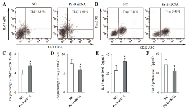 To block the role of Pir-B in vitro, DCs isolated from 5-week tumor-bearing mice were transfected with siRNA Pir-B, and co-cultured with CD4+ T cells. First, the inhibitory efficiency of Pir-B in vitro was estimated after transfection, Pir-B siRNA significantly reduced the mRNA and protein levels of Pir-B. The apparent decrease (69.6%) was observed at 3 days after transfection. Next, the higher levels of MHC-II, CD86 and IL-6 were observed in Pir-B siRNA group with negative control (NC) group (Figure 6), whereas the difference in the level of IL-12 was not significant. The inhibited expression of Th17 cells and IL-17 was restored, whereas the augmented expression of Tregs and TGF-β was diminished in Pir-B siRNA group compared with NC group (Figure 7). These findings suggest that Pir-B inhibited the DC function and disturbed the Th17/Treg balance.