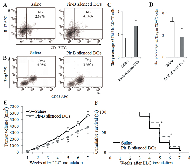 Figure 8: In vivo transfer of Pir-B silenced DCs increased Th17 response and decreased Treg differentiation. DCs transfected with Pir-B siRNA (1 × 106 cells per mice) were transferred into recipient animals by tail vein injection at 1, 2 and 3 weeks after LLC inoculation. Saline (0.1ml) was considered as control. The percentages of tumor infiltrating Th17 (A) and Tregs (B) cells were measured. The percentages of Th17 (C) and Treg (D) cells were shown in the histogram. Tumor growth (E) was monitored once weekly, and tumor volume was assessed by measuring tumor size with digital calipers. Ten mice from each group were randomly selected for the survival rate analysis (F). *P<0.05, **P<0.01 versus Saline.