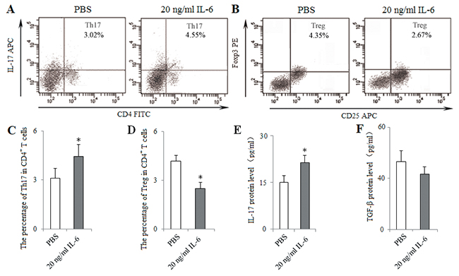 Figure 9: In vitro administration of IL-6 induced Th17 response and inhibited Treg differentiation. IL-6 was administered at the optimal dose (20 ng/ml) in a co-culture of CD4+ T cells and DCs isolated from spleen of 5-weeks tumor-bearing mice at the ratio of 10:1, 2.5 μg/ml anti-CD28 mAb in anti-CD3 mAb-coated (5 μg/ml) 96-well plates. PBS (0.1ml) was considered as control. After 48 h of co-culture, the percentages of Th17 (A) and Treg (B) cells were analyzed with flow cytometry. The percentages of Th17 (C) and Treg (D) cells were shown in the histogram. The protein levels of IL-17 (E) and TGF-β (F) in the supernatant of co-cultures were assessed using ELISA. *P<0.05, **P<0.01 versus PBS.
