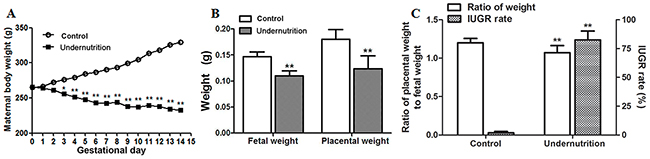 Figure 1: Developmental parameters of rats under prenatal maternal undernutrition. The pregnant rats were fed a restricted diet (50% of the daily food intake of the control rats) from gestational day (GD) 0 to GD14. On GD14, the rats were anesthetized with isoflurane and sacrificed. (A) Maternal body weights; (B) fetal weights and placental weights; (C) intrauterine growth retardation (IUGR) rates and the ratio of placental weight to fetal weight and. Mean ± SD, *P<0.05, **P<0.01, two-sided t-test, n = 6 control vs. 5 undernutrition pregnant rats.