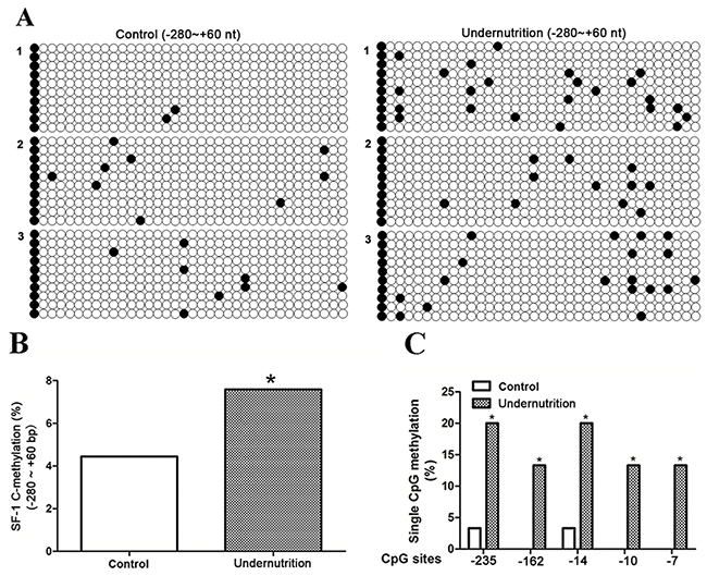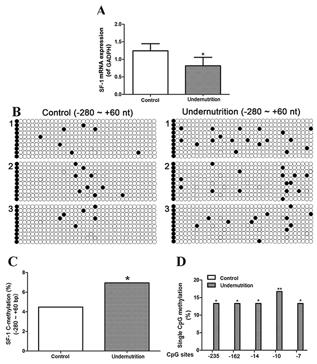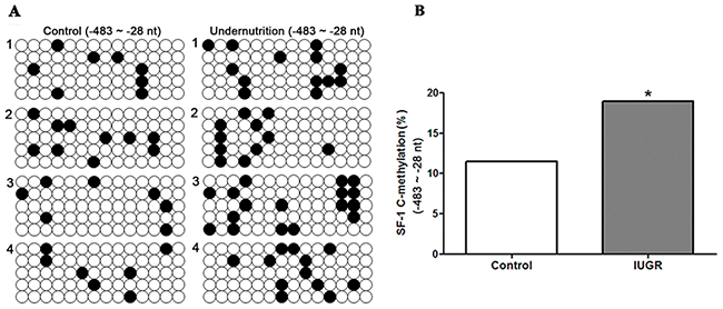Furthermore, we compared the DNA methylation status of SF-1 promoter in human maternal blood between normal pregnancy and pregnancy with IUGR. In order to reduce sampling deviation, age, BMI and gestational age were kept consistent between the two groups. Although no single CpG sites of the SF-1 promoter showed significantly different DNA methylation rates between the two groups, the total methylation frequency of SF-1 promoter in the IUGR group was much higher than that of the control. These results implied the possibility of SF-1 hypermethylation in maternal blood as a potential IUGR biomarker in clinic, despite the relatively low number of pregnant women in this study.