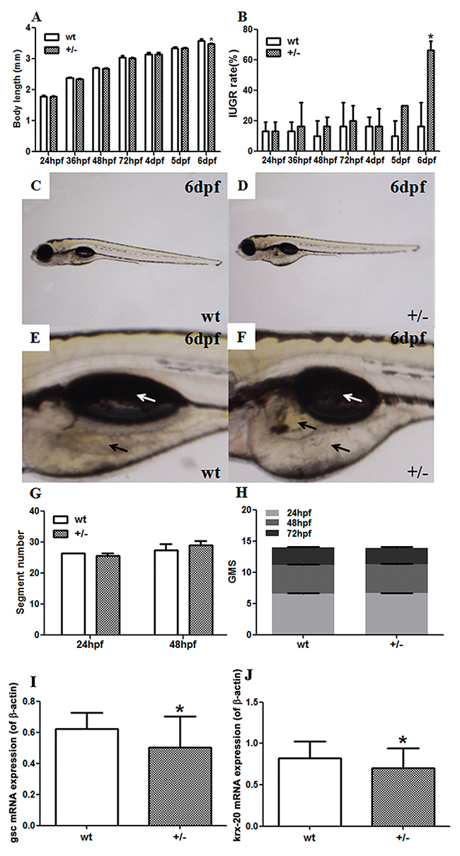 At postnatal week 12, F2 MT zebrafish were backcrossed with the WT zebrafish. At 12 hpf, dead or deformed F3 embryos were removed. The body length, yolk sac absorption and IUGR rate were recorded at 24 hpf, 36 hpf, 48 hpf, 72 hpf, 4dpf, 5 dpf and 6 dpf, respectively. The embryo was taken as IUGR when its body length was 10% shorter than the mean body length of the control group [46]. The body segment number was recorded at 24 hpf and 48 hpf. And embryonic development was scored at 24 hpf, 48 hpf and 72 hpf, following the GMS [48].