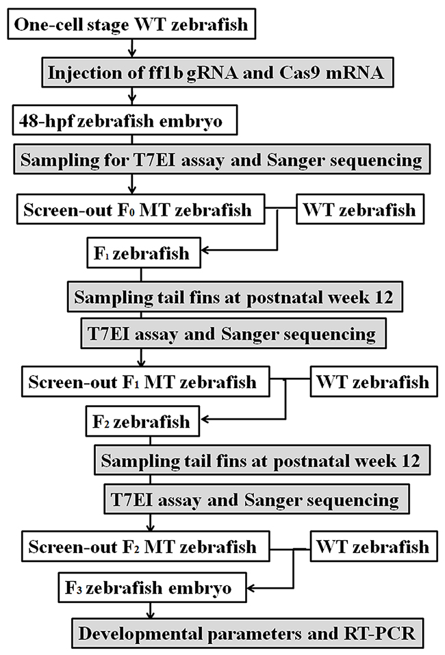 Figure 7: The experimental scheme for CRISPR/Cas9 targeted fushi tarazu factor 1b (ff1b) mutation in zebrafish. hpf: hour post-fertilization; MT: mutant-type; RT-PCR: reverse-transcription PCR; T7EI: T7 endonuclease I; WT: wild-type.