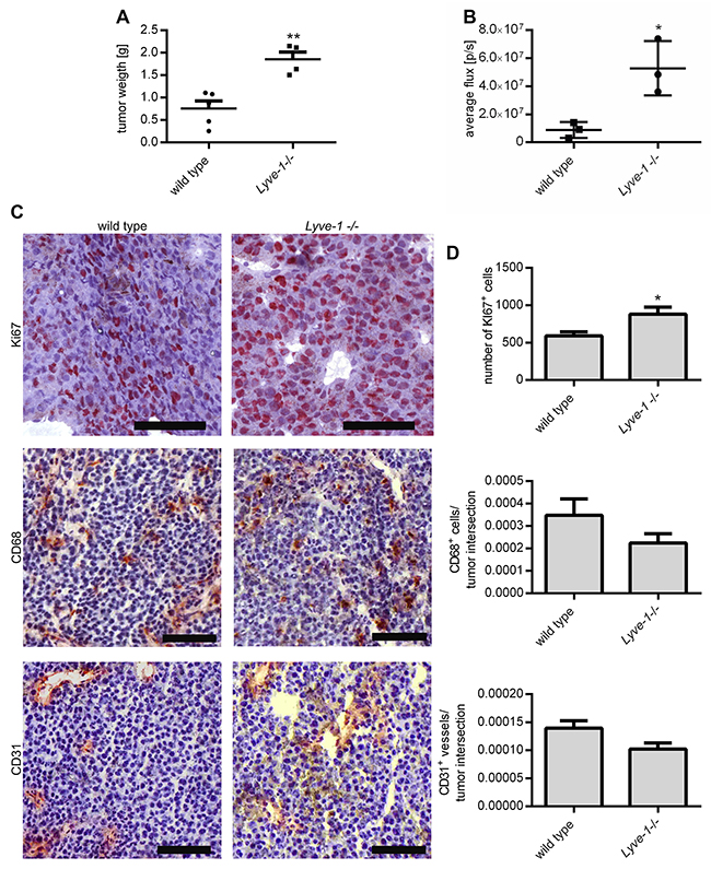 To determine the relevance of LYVE-1 on melanoma growth in general, a murine model with a global knockout of the Lyve-1 gene was used. These mice have already been characterized elsewhere to have an overtly normal phenotype, developing a functional lymphoid system except for enlarged lymphatic vessels in the liver and intestine leading to a constitutively increased interstitial fluid flow [15, 16]. At first, the growth of B16F1 melanoma transplant tumors in C57BL/6 Lyve-1 knockout mice was examined and compared to tumor growth in wild-type control mice. Ten days after subcutaneous injection of the melanoma cells, the mice were sacrificed and the weight of the excised non-ulcerated tumors was determined. Lyve-1 deficiency led to a significantly increased tumor end weight (Figure 2A). Monitoring of B16F10 LUC tumors in vivo by luminescence measurement further sustained the tumor-inhibiting role of LYVE-1. Here, the average photon flux, which strongly correlates with tumor volume, was significantly increased in tumors developing in Lyve-1 -/- mice already seven days after tumor cell injection compared to tumors in wild-type mice (Figure 2B). Immunohistological stainings of murine B16F1 transplant tumors revealed that significantly more cells were stained positive for the proliferation marker Ki-67 in tumors grown in C57BL/6 Lyve-1 -/- correlating with the increased tumor end weight. In contrast, staining with antibodies against CD68 and CD31 revealed in both cases only minor, non-significant reductions of myeloid cells and vessels in tumors grown in the Lyve-1 knockout mice (Figure 2C, 2D).