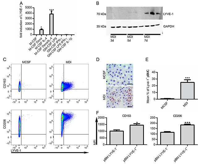 Figure 3: Lyve-1 is expressed in M2-like macrophages. (A) Peripheral blood monocytes (pBM) were treated for seven days with different pro- and anti-inflammatory stimuli as indicated and LYVE-1 expression was assessed as fold change over M-CSF treated pBM (n=3). (B) pBM were treated with MCSF/dexa/IL-4 (MDI) for 3, 5 and 7 days as indicated. Protein expression of LYVE-1 was determined by western blot (n=3). (C) Determination of co-expression of LYVE-1 with macrophage markers CD163 and CD206 respectively by FACS. Representative experiments are shown. (D) pBM were stimulated for seven days with M-CSF or MDI as indicated. Cytospins were fixed with PFA and stained with anti-LYVE-1, scale bars = 20 μM. (E) Flow cytometric quantification of LYVE-1 surface expression in M-CSF or MDI treated cells, (n = 8). (F) Comparison of marker expression levels between LYVE-1+ and LYVE-1- MDI treated pBM by evaluation of MFI (median fluorescence intensity), (n = 10).