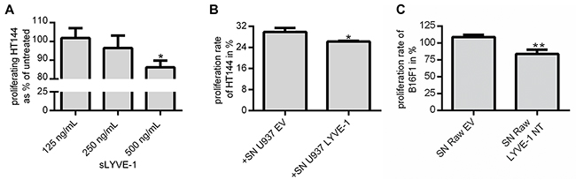 The high sequence homology of Lyve-1 and CD44 implies possible functional similarities between these HA-receptors at least to some extent. In a transplant model of malignant melanoma, the ectodomain of CD44 significantly reduced the tumor volume because of inhibition of tumor cell proliferation [19]. To test whether the shedded ectodomain of LYVE-1 also functions as a decoy receptor for the respective ligands such as HA, the proliferation rate of human and murine melanoma cell lines was evaluated after exposure to sLYVE-1 in vitro. Initially, the proliferation rate of the human melanoma cell line HT144 was assessed after treatment with synthesized sLYVE-1 showing that 500 ng/mL sLYVE-1 significantly inhibited melanoma cell proliferation (Figure 5A). In a similar manner, cultivation of HT144 in U937 conditioned medium resulted in a significant inhibition of proliferation of the human melanoma cell line specifically in medium derived from U937 LYVE-1+ cells (Figure 5B). Comparable results were also obtained using a murine model. It has been demonstrated previously that LMW-HA induces cell proliferation in B16F1 [20] (Supplementary Figure 3). The murine macrophage cell line RAW 264.7 was genetically engineered to express the ectodomain LYVE-1 NT. Conditioned medium from these cells was used for the cultivation of B16F1 in culture vessels which were coated with LMW-HA. Cellular proliferation was significantly inhibited when B16F1 were cultured in conditioned medium derived from Raw 264.7 Lyve-1 NT+ cells (Figure 5C).