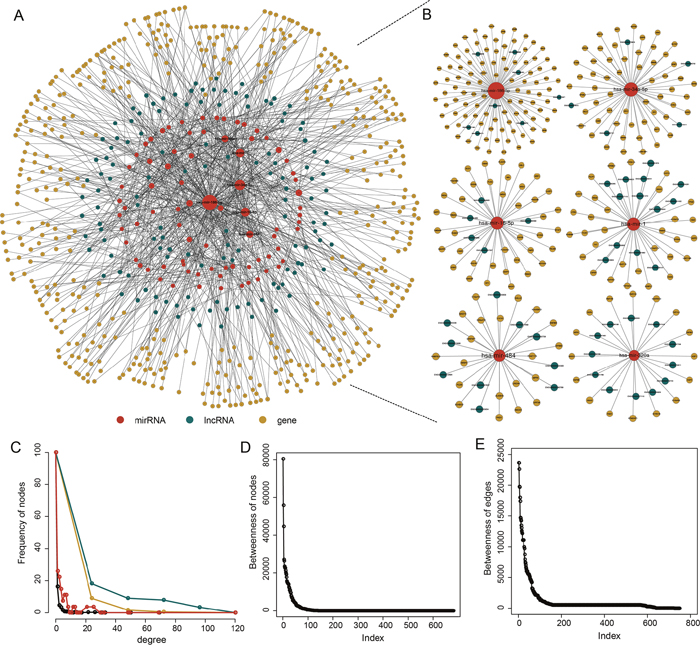 Figure 1: The PAAD-specific ceRNA network. (A) The global PAAD-specific ceRNA network. (B) The top 6 miRNAs (miR-186-5p, miR-34a-5p, miR-16-5p, miR-1, miR-484, and miR-320a) ranked by node degree. (C) The degree distribution of the ceRNA network nodes. (D) The betweenness of the ceRNA network nodes. (E) The betweenness of the ceRNA network edges.