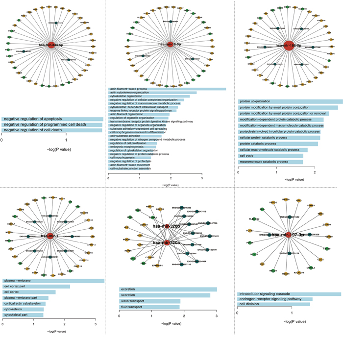 For each miRNA in a network, the degree is defined as the number of edges to which it is connected. Hub miRNA with higher degrees in biological networks are most likely to essential. Thus, in this work we selected the top six miRNAs with the highest degrees in the ceRNA network as the hubs. We also analyzed other topological attributes of the network, such as the degree of each node type and the betweenness of the nodes and edges.