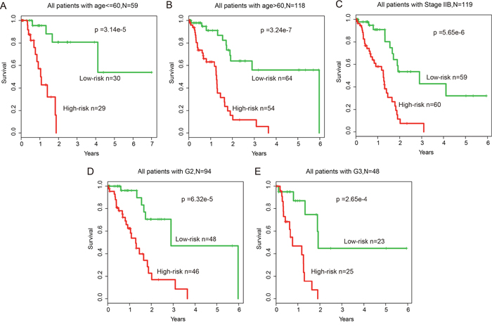 In addition, multivariate analysis and stratification analysis was carried out in order to assess the independence of the risk score model with respect to other clinical features. Results of multivariate analysis showed that the risk score model still has a significant association with OS after adjusting for other clinical features in training (HR=1.587, 95% CI: 1.168-2.155, p=3.00e-3), test (HR=1.876, 95% CI: 1.379-2.552, p<1.00e-4) and entire (HR=1.562, 95% CI: 1.307-1.868, p<1.00e-4) datasets (Table 1). Stratification analysis indicated that the risk score model is independent of age, grade and stage, as it performed equally well in different age groups (log-rank test p=3.14e-5 for patients <=60 years and p=3.24e-7 for patients >60 years), in patients with stage IIB (log-rank test p=5.65e-6) and in patients with grade G2 or G3 (log-rank test p=6.32e-5 for patients with G2 and p=2.65e-4 for patients with G3) (Figure 6A-6E).