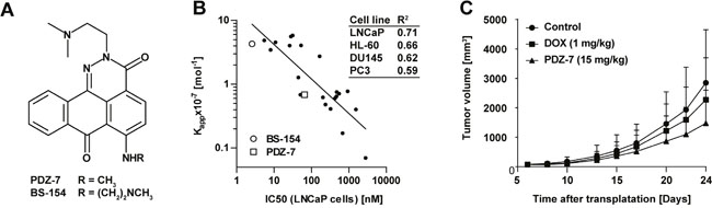 Figure 1: PDZ-7 is a DNA binding compound with promising in vivo properties. (A) Chemical structures of anthrapyridazones PDZ-7 and BS-154. (B) Tumor growth inhibition by PDZ-7. Athymic Foxn1nu mice were transplanted subcutaneously with doxorubicin-resistant LoVo/DX colon cancer cells, and xenografts were allowed to grow to 70 mm3. Mice were injected with PDZ-7 (15 mg/kg) or doxorubicin (ADR, 1 mg/kg) on days 6, 13 and 20 following tumor transplantation. Mean tumor volumes [mm3] are plotted against days after transplantation for control and drug treated mice (10 mice were used for each condition). Both PDZ-7 and doxorubicin were used in comparable dose of c.a. 0.3 maximum tolerated dose (MTD). (C) Comparison of DNA affinity of 23 anthrapyridazones, defined as apparent DNA binding constant (Kapp, 10-7 Mol-1) and cytotoxicity in 4 cell models: LNCaP, PC3, DU145 (prostate cancer) and HL-60 (acute myeloid leukemia). Linear determination coefficients (R2) calculated for each pair of values are shown in the inset. Two selected compounds, BS-154 and PDZ-7 are explicitly marked. DNA affinity was measured by ethidium bromide displacement assay and cytotoxicity by manual counting after 72-hour exposure to drugs. Original data are disclosed in the granted US Patent [11].