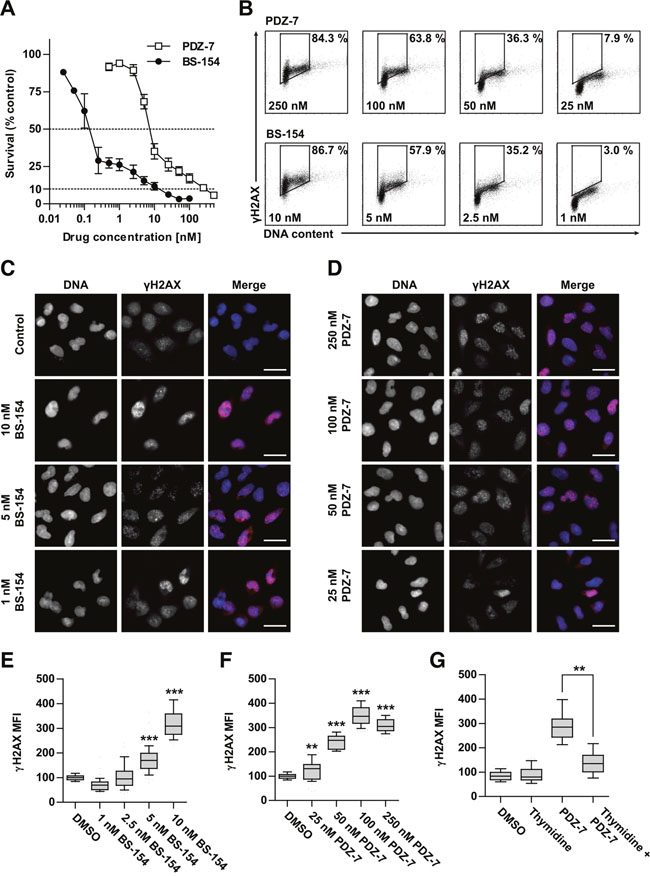 Figure 3: Anthrapyridazones BS-154 and PDZ-7 induce cytotoxic double stranded DNA breaks. (A) Cytotoxicity of PDZ-7 and BS-154 towards A549 cells after 120 hours of continuous exposure to each drug, determined by MTT assay. Each point represents mean ±S.D. from three independent experiments. (B) Induction of DNA strand breaks after 1 hour of drug treatment with regard to cell cycle phase. A549 cells were stained with propidium iodide (DNA content) and anti-γH2AX antibody conjugated to Alexa-594. Percentage of cells with high γH2AX level is shown for each scatter plot. (C and D). Dose dependent formation of γH2AX foci after 1 hour of treatment with PDZ-7 and BS-154 shown by immunofluorescence. DNA was counterstained with DAPI. Scale bar: 25 μm. (E and F) quantification of the median γH2AX fluorescence signal intensity over the nucleus area in. (G) Asynchronously growing or thymidine synchronized A549 cells were treated with 250 nM PDZ-7 for 1 hour, before anti-γH2AX staining. Quantification of γH2AX was performed as in E and F. Each box in panels E-G represents data for 50 nuclei scored and statistical significance was determined using two-tailed Mann-Whitney test.