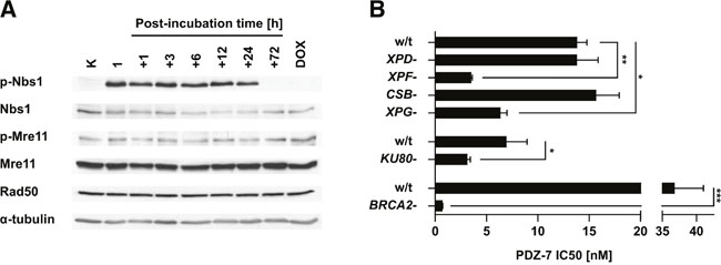 Figure 4: PDZ-7 induces DNA damage response and is selectively cytotoxic towards DNA repair-deficient cells. (A) Induction of DNA-damage response over the course of PDZ-7 treatment. A549 cells were treated with 250 nM PDZ-7 for 1 hour and post-incubated in drug-free medium up to 72 hours. Activation of MRN complex was determined by Western Blotting, using antibodies towards Nbs1 phosphorylated at Ser343 (p-Nbs1), Mre11 at Ser676 (p-Mre11) and total Rad50. (B) CHO AA8-derived UV sensitive mutants with defects in nucleotide excision repair pathway displayed specific sensitivity to PDZ-7. Nuclease-deficient variants UV41 (XPF-) and UV135 (XPG-) were 4.0 and 2.2 times more sensitive (IC50 value), compared to cells with defects in damage recognition (UV61, CSB-) and in helicase activity (UV5, XPD-). Loss of Ku80 protein involved in NHEJ repair in xrs6 cells amounted to 2.2-fold increase in sensitivity in comparison to parent CHO-K1 cells. V-C8 cells deficient in DNA damage repair via HR (BRCA2-) had 53-fold lower PDZ 7 IC50 value in comparison to parent V79 cells. Statistical significance was determined using two-tailed Student t-test.