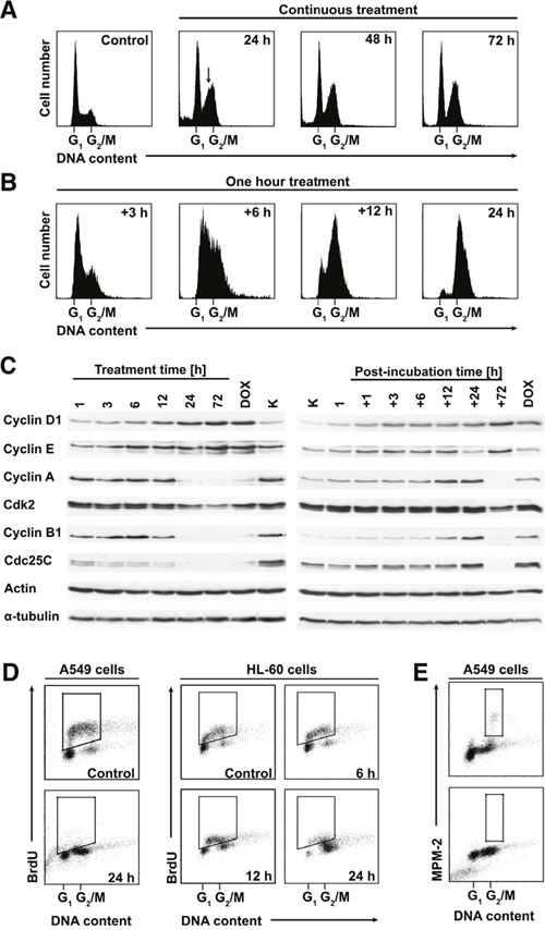 Figure 5: PDZ-7 induces unusual perturbations in cell cycle. (A) Continuous exposure to PDZ-7 led to atypical dual G1 / late S cell cycle arrest, which persisted up to 72 hours. (B) Short treatment (one hour) and post-incubation in drug-free medium induced synchronous progression through S phase and G2 arrest. (C) Expression of cell cycle regulating proteins during prolonged and short treatment times was evaluated by Western Blotting. (D) Inhibition of DNA synthesis and S-phase progression by IC90 concentrations of PDZ-7 observed independently in two model cell lines: A549 and HL-60 (acute myeloid leukemia). DNA synthesis was determined by BrdU incorporation into nascent DNA and detection with anti-BrdU antibodies. BrdU-positive cells are shown for each scatter plot. (E) Inhibition of mitotic activity by PDZ-7, determined by staining for mitosis-specific MPM-2 phosphoepitope.
