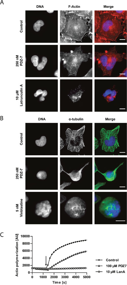 Figure 6: PDZ-7 causes cytoskeleton destabilization in A549 cells. (A) Changes in phalloidin-stained F-actin cytoskeleton morphology and (B) changes in α-tubulin cytoskeleton in A549 cells treated with 250 nM PDZ-7 for 24 hours. 10 μM latrunculin A and 5 nM vinblastine were used as positive controls for A and B, respectively. Scale bar: 10 μm. (C) Polymerization of rabbit muscle G-actin to F-actin in the presence of ATP and DMSO (control) or studied drugs: 100 μM PDZ-7 or 10 μM latrunculin A (LanA). Arrow points to polymerization initiation. Note lower initial amount of F-actin in PDZ-7 sample, compared to control.