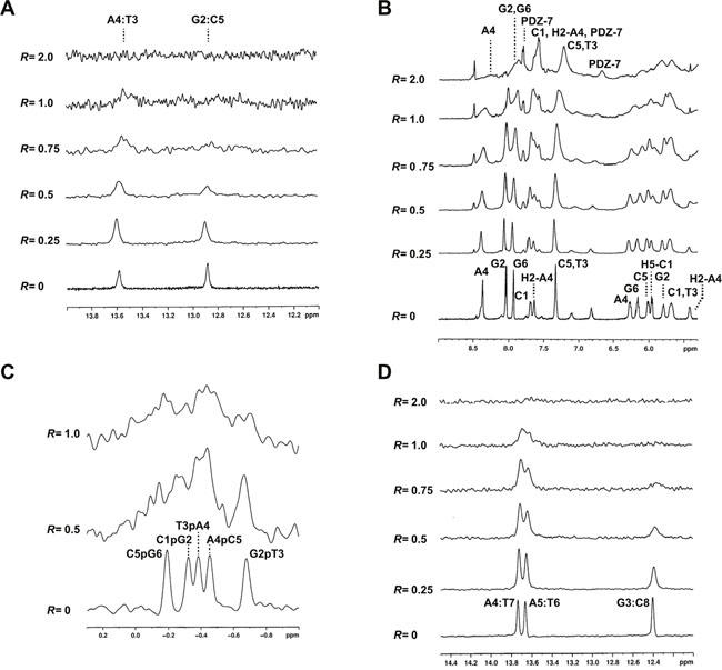 Figure 7: PDZ-7 does not bind DNA by intercalation. (A) Imino proton region of d(CGATCG)2 duplex titrated with PDZ-7 from R= 0 to 2.0. (B) Aromatic and anomeric proton region of the same spectrum. (C) 31P spectrum of d(CGATCG)2 duplex titrated with PDZ-7. (D) Imino proton region of d(AAGAATTCTT)2 duplex titrated with PDZ-7 from R= 0 to 2.0.
