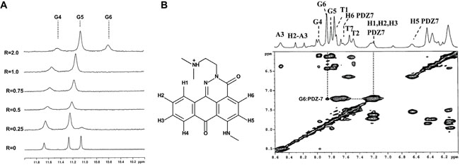 Furthermore, it was interesting to check if PDZ-7 can interact more specifically with G-quadruplex DNA structures, presumably formed in telomeric and other G-rich DNA regions of chromosomes [45]. We used d(TTAGGGT)4 as a model of in vitro G-quadruplex-forming oligonucleotide that does not aggregate and is known to form a four stranded G–quadruplex complex (parallel strand orientation) [46]. During the titration of PDZ-7 in d(TTAGGGT)4 solution the original signals of G4-G6 imino experiment exhibited an upfield shifts (Table 2) broadened at high R values. G4NH changed its shape together with the G6 NH imino proton and disappeared at low R, but sharpened again for R= 2.0 (Figure 8A). The signals of the ligand in the complex (Figure 8B) were broad as well, likely due to the movement of the PDZ-7 inside the binding site and as a consequence of equilibrium between the free and the bound ligand (Table 3). Again, line broadening and the overlapping of aromatic protons of the oligonucleotide with PDZ-7 aromatic protons made it difficult to observe NOE signals. Nonetheless, few NOEs involving the G6 unit (H8 and H2’-H2’’) were detected with H2-H3 aromatic protons of the PDZ-7 (Figure 8B), together with the broadening and upfield shift of G6 NH (-0.5 ppm), suggesting that one binding site at the level of G6 is likely to be involved. Drug association with G4 did not alter composition of G tetrad, as follows from the characteristic inter-strand NH-NH interactions (not shown). Interestingly, it was observed that the A-tetrad was not conserved, evidenced by the lack of the NOEs between G4NH with A3NH2 and A3H2, which are typical interactions of the A tetrad, as well as the NOE of A3H8 with A3H2. Thus it is conceivable that a second binding site could be at the level of G4 residue even if no NOEs interactions between PDZ-7 and G4 were found. Interaction of PDZ-7 at the level of G6 tetrad suggests that it can form only a cap-complex with G-quadruplex.
