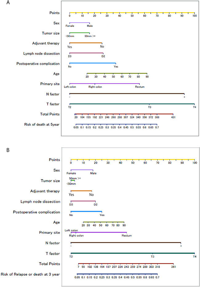 Several previous studies developed a nomogram for patients with colon and/or rectal cancer [9]. Various target outcomes predicted by the nomogram have been reported, including postoperative complications [10, 11], operative mortality [12], distant metastasis [6, 8], peritoneal recurrence [13] and side effects of chemotherapy [14]. However, the quality of such oncological prognostic prediction models was insufficient. Indeed, previous studies are aossiciated with several critical problems, such as small sample sizes, an insufficient c-index, limited target outcomes, such as peritoneal recurrence or a lack of any validation or calibration [9]. The main reason for these shortcomings might be the difficulty in obtaining accurate clinical datasets including long-term outcomes, such as the five-year OS or relapse-free survival (RFS).