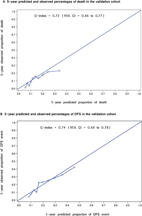 Figure 2: Calibration plot for Overall Survival and Disease Free Survival. (A) The relationship of the 5-year predicted and observed percentages of death in the validation cohort (B) The relationship between the 3-year predicted and observed percentages of recurrence in the validation cohort.