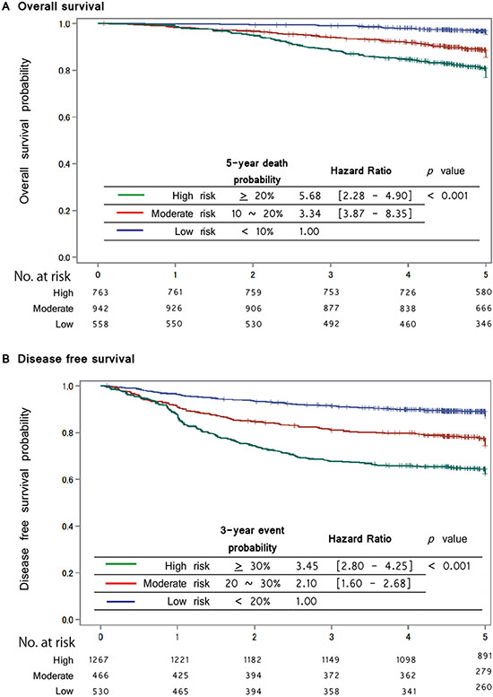 Figure 3: Kaplan-Meier curve stratified by risk group for the Overall Survival and Disease Free Survival in the validation cohort Kaplan-Meier curves of risk group stratification for overall survival in the validation cohort. (A) The blue line represents a low risk; a predicted 5-year death probability of < 10%, the red line represents a moderate risk; a predicted 5-year death probability of from 10 to < 20% and the green line represents a high risk; a predicted 5-year death probability of 20% ≥. All curves were statistically different (log-rank test, p < 0.01). (B) Kaplan-Meier curves of the risk group stratification for disease free survival in the validation cohort. The blue line represents a low risk; a predicted 3-year recurrence probability of < 20%, the red line represents a moderate risk; a predicted 3-year recurrence probability of from 20 to < 30% and the green line represents a high risk; a predicted 3-year recurrence probability 30% ≥. All curves were statistically different (log-rank test, p < 0.01).