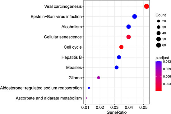 In order to investigate the main function of the aforesaid seed genes, we performed KEGG pathway enrichment analysis using clusterProfiler. The result showed that these genes were enriched in several key cancer-related signaling pathways such as cell cycle, cellular senescence, pathways in cancer (Supplementary Table 3). The top 10 pathways were shown in Figure 2.