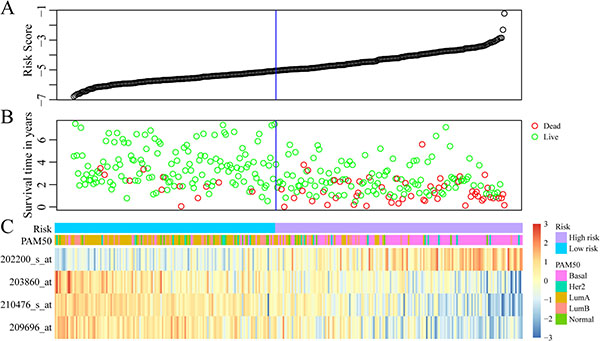Figure 4: Construction of prognostic risk score model based on 4-gene signature. (A) The risk score of each sample. (B) Different survival status according to the risk score. (C) The mRNA expression of four signature genes in each sample with different risk score.