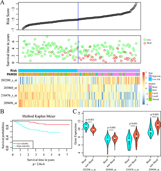 Figure 8: External validation of 4-gene signature. (A) Top: The risk score of each sample in validation set; Middle: Corresponding survival status of each sample; Bottom: The mRNA expression of four signature genes in each sample with different risk score. (B) Kaplan–Meier curves for patients in high and low-risk groups. (C) The mRNA expression of four signature genes in Basal-like and non-basal-like patients.
