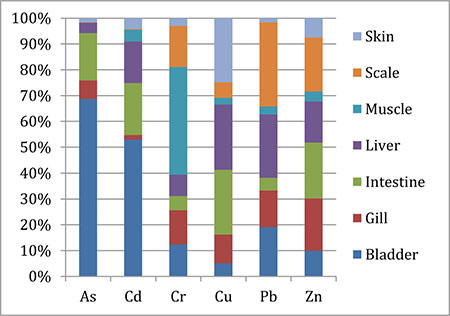 This study provided valuable information of As, Cd, Cr, Cu, Pb, Zn distribution in different tissues (bladder, gill, intestine, liver, muscle, scale and skin) of various fish (bighead carp, crucian carp, grass carp, mandarin fish, small crucian carp and yellow catfish) captured from Honghu Lake. In general, the heavy metals and metalloid concentrations in muscle of all fish were within the corresponding standards, except the Cr concentration in muscle of crucian carp. There was no significant health risk for the local people through consuming fish muscle and mixed fish tissues, based on the calculation results of THQ, CR, and EWI. For local residents, grass carp was recommended as the daily consuming fish species, which had relatively lower toxic metals accumulation abilities, and followed by yellow catfish and mandarin fish. Fish intestine, liver and bladder were recommended not be added in diet ingredients due to their high accumulation abilities in toxic elements. Consuming less than 1,316 g/d wild fish muscle or 525 g/d mixed wild fish tissues for an individual could basically assure local inhabitants' health. For local government, Pb and Cr were regarded as relatively major contributors for non-carcinogenic risks and were recommended as key factors for aquatic environment regular monitoring in Honghu Lake. Crucian, which had relatively higher bioaccumulation ability in Pb and Cr, was recommended as a sensitive bioindicator in water quality monitoring.