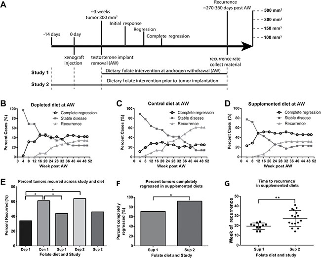 Figure 2: Dietary folate levels alter the kinetics of prostate cancer recurrence. (A) Experimental study design. In study 1 diets were started at the time of androgen withdrawal. In study 2 diets were started ~14 days prior to xenograft injection. Tumors were followed for a maximum of 50 weeks post androgen withdrawal. 4 points of observation were noted, initial response (defined as reaching < 300 mm3 (the original tumor volume at androgen withdrawal), regression (< 150 mm3), complete regression (< 100 mm3) and recurrence (> 500 mm3). (B–D) Analysis of recurrence status every 4 weeks post androgen withdrawal. The graph indicates the percent of animals every 4 weeks considered to have complete regression (black circle), stable disease (dark grey square) and recurrence (grey triangle). (E) Percent cases which recurred for each diet in study 1, and depleted and supplemented diets from study 2 by week 42. (F) Number of animals that completely regressed (reached < 100 mm3) in animals on a supplemented diet at androgen withdrawal and supplementation prior to xenograft implantation. (G) Week of recurrence for animals on a supplemented diet in study 1 and study 2. AW refers to androgen withdrawal. Statistical analyses were made using a Fisher’s Exact test comparing number of recurred and non-recurred cases. (*p < 0.05)