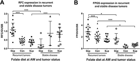 Figure 4: Folate uptake and retention enzymes are altered in response to folate depletion. (A) mRNA expression levels as measured by Real Time RT-PCR for the reduced folate carrier (RFC) and (B) folylpolyglutamate synthase (FPGS) normalized to glucuronidase beta (GUSB) in the recurrent and stable disease tumors for each diet from study 1. AW refers to androgen withdrawal. Statistical analyses were made using an unpaired student t-test with Welch’s correction (*p < 0.05: ***p < 0.001)