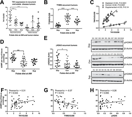 We measured the mRNA expression of TYMS and TK1, as well as the levels of γH2AX and dUMP. Recurrent tumors from animals on a depleted diet had higher TK1 expression (Figure 5A) but lower TYMS expression (Figure 5B), indicating decreased biosynthetic potential but increased thymidine salvage. This suggests that under folate depleted conditions tumors upregulate TK1 to salvage nucleotide pools while at the same time leading to decreased biosynthesis through TYMS. Stable disease tumors on the depleted diet had significantly lower TK1 expression than recurrent tumors, while this was not the case for control and supplemented tumors (Figure 5A). Additionally, TYMS and TK1 expression strongly correlated in both folate depleted and control recurrent tumors, but this correlation is lost with folate supplementation (Figure 5C). TYMS expression was also significantly lower in folate supplemented tumors.
