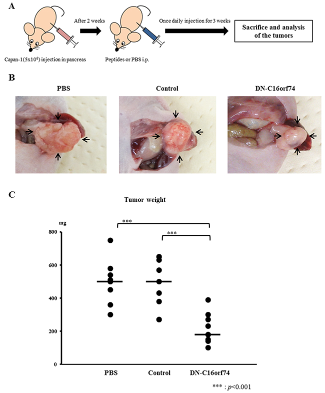 Figure 3: DN-C16orf74 treatment in an orthotopic xenograft model. (A) The treatment protocol for the orthotopic xenograft model is shown. Capan-1 cells (5×106) were implanted into the pancreas of BALB/c nu/nu mice. Two weeks later, the cell-permeable peptides (control peptide or DN-C16orf74, 9 mg/kg) or PBS were injected intraperitoneally once daily. Three weeks later, the mice were sacrificed. (B) Representative pancreatic tumors from the three groups (PBS, control, and DN-C16orf74) are shown. Arrowheads indicate pancreatic tumors. (C) Comparison of the tumor weights in the three groups. The dot plots (n = 9, respectively) represent tumor weight, and the bars represent the medians. Tumors treated with DN-C16orf74 were significantly smaller than the other tumors (vs. PBS; p < 0.001, and vs control; p < 0.001).