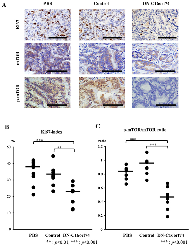 To further characterize the effect of DN-C16orf74 in orthotopic tumors, we performed immunohistochemical staining for Ki67, mTOR, and p-mTOR (Figure 4A). Almost all of orthotopic tumors had C16orf74 expression (Supplementary Figure 2). The median Ki67-index was 37.9% (range, 21.1-42.0%) in the PBS group and 32.5% (range, 23.1-44.5%) in the control peptide group, but that in the DN-C16orf74 group was significantly lower, 23.3% (range, 12.1-29.3%) (vs the PBS group; p < 0.001, and vs the control peptide group; p < 0.01, Figure 4B). In addition, the median p-mTOR/mTOR ratio was 0.84 (range, 0.66-0.94) in the PBS group and 0.97 (range, 0.71-1.11) in the control peptide group, but that in the DN-C16orf74 group was significantly lower, 0.47 (range, 0.18-0.67) (vs the PBS group; p < 0.001, and vs the control peptide group; p < 0.001, Figure 4C). Furthermore, regression analysis showed significant correlation between orthotopic tumor weight and p-mTOR/mTOR ratio (r=0.701, p<0.001, Supplementary Figure 3). On the other hand, the median TUNEL numbers of the three groups were not significantly different respectively (Supplementary Figure 4).