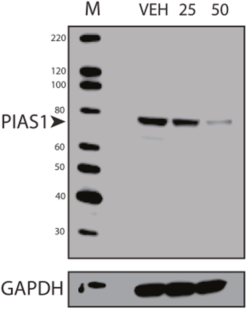 Figure 7: Repression of PIAS1 with Anacardic Acid Treatment. Western blots of protein from 8505C cells treated with vehicle only (VEH) or AA at 25 μM (25) or 50 μM (50) for 96 hours and analyzed for PIAS1 expression with GAPDH loading control; M shows lane with markers. Data demonstrate a dose-dependent repression of PIAS1.
