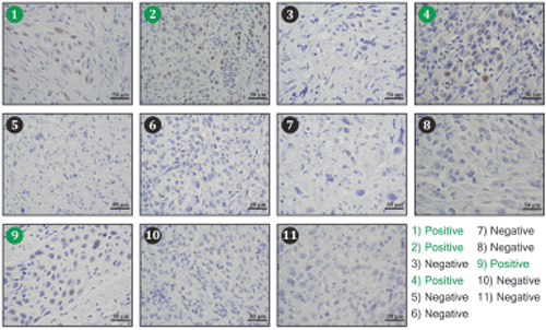 Figure 10: Immunohistochemistry for TFAP2A Expression in ATC Tumors. Eleven archival ATC tumor specimens were examined for TFAP2A expression by immunohistochemistry. Tumors 1, 2, 4, and 9 (denoted in green) demonstrated positive brown nuclear TFAP2A staining.