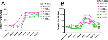 Figure 1: Reactivity of immunized subjects’ serum antibodies against P10s. ELISA plates were coated with the multivalent-antigen peptide (MAP) version of P10s, and reactivity of two-fold serial dilutions of sera from the weeks indicated on the horizontal axes was detected by HRP-conjugated anti-human IgG (A) and IgM (B). Normalized anti-peptide endpoint titers were estimated as described in the Methods section.
