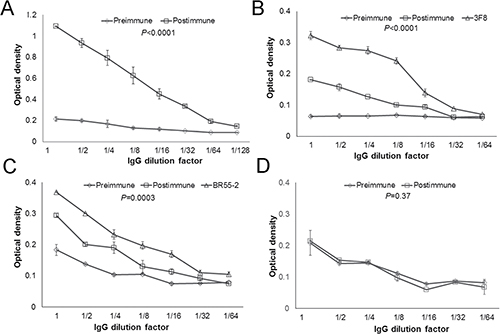 The resulting absorbance-versus-dilution curves derived from anti-peptide ELISA assays were used to estimate normalized endpoint titers as previously described [37]. SAS 9.3 (The SAS Institute, Cary, NC) was used to calculate the endpoint titers of anti-P10s antibodies and analyze them for changes with respect to time, dose cohort, and their interaction using the nonparametric repeated-measures method of Brunner et al. [75] and in particular, using the recommended ANOVA-type statistics from this method. Excel 2010 (Microsoft Corporation, Redmond, WA) was used to evaluate the effect of vaccination on plasma cytotoxicity towards cell lines by one-sample t-test on paired differences. To compare the binding of purified IgG fraction of pre and postimmune sera to the peptide and carbohydrates, the slopes of the dilution curves were calculated and compared using regression analysis performed by GraphPad Prism version 5.00 for Windows (GraphPad Software, San Diego, CA).