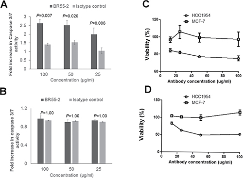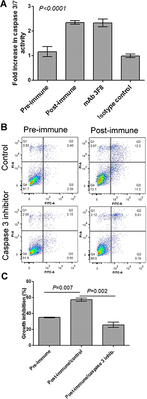 Apoptosis was determined using FITC-conjugated Annexin V (Life Technologies, Grand Island, NY) by flow cytometry as described earlier [37]. Caspase-3 activity was measured using Apo-ONE® Homogeneous Caspase-3/7 Assay (Promega, Madison, WI), following manufacturer’s instructions. Briefly, cells were seeded in wells (1×104 cells/ well) of a 96-well plate in complete media overnight. Media were replaced the next day with media supplemented with 10% of either FBS (control), preimmune, or postimmune serum or plasma. Alternatively, mAbs were added in medium containing 5% FBS. Cells were incubated at 37ºC for an additional 8 to 48 hours, then Apo-ONE® Caspase-3/7 Reagent was added to wells in a 1:1-volume ratio. Plates were then gently shaken at 500 rpm for 1 min and incubated at room temperature for 1–2 hours. Caspase activity was quantified using a fluorescence reader with a 490-nm excitation filter and 520-nm emission filter.