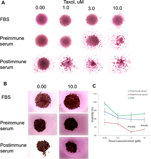 The growth-inhibitory role of serum antibodies against MDA-MB-231 and ZR-75–1 cells was assayed in a 3-D culture. 3000 cells were seeded in Corning® round-bottom ultra-low attachment 96-well plates (Corning Inc., Lowell, MA) and were allowed to grow for 2 to 3 days to generate spheroids. Pre- and postimmune sera were then added into wells as described above. The cells were left to grow for 24 hours when the medium was refreshed using medium containing various concentrations of Taxol. Cells were then left to grow for another 48 hours, after which pictures were taken and viability was determined using alamarBlue® cell viability assay (Thermo Fisher Scientific Inc., Waltham, MI) according to the manufacturer’s instructions. Fluorescence intensity was measured (Microplate Fluorescence Reader (Bio-Tek Instruments, Winooski, VT) and percent viability relative to the wells with FBS was quantified. Images were taken using EVOS™ XL Core cell imaging system at 10X magnification.