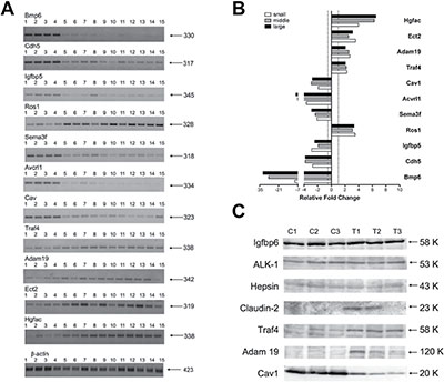 The solid tumors of c-Myc transgenic mice were classified as papillary lung adenocarcinomas [6]. To follow gene expression changes during disease progression RNA was prepared from small, middle and large sized tumors and analyzed by whole genome microarrays. Note, with the exception of middle sized tumors, i.e. 5 mm in diameter, the small (1 mm) and large tumors (> 10 mm) expressed c-Myc transcripts > 50-fold. Given in Table 1 are the Fold Changes (FC) of a panel of genes that were either up- or down-regulated upon c-Myc over-expression in PLACs and that were further analyzed in this study (for an extended presentation of the whole list of differentially expressed genes refer to Supplementary Table 1). Statistical analysis of replicates with T-test and stringent comparative ranking was performed to identify significantly regulated genes in tumors as compared to non-transgenic healthy lungs. The thresholds for significance testing were defined as mean FC > 3, p-value in T-test < 0.05, and 100% “Increase” calls in comparative ranking analysis at least in one set of tumors for up-regulated genes, and FC < -3, p-value in T-test < 0.05, and 100% “Decrease” calls for down-regulated genes. Significantly regulated genes were further analyzed with regard to their functional annotation and previous knowledge on c-Myc responsiveness, based on publically available information, and for the presence of c-Myc binding sites in their promoters using positional weight matrices. The data analysis focused on extracellular signaling, adhesion, angiogenesis and invasion, and Supplementary Table 1 compiles genes categorized into functional groups and their known c-Myc responsiveness. Representative examples include the autocrine growth factor amphiregulin and the mitogen-activated protein kinase kinase 1 (MEK) both of which were specifically up-regulated, whereas genes negatively influenced by Erk signaling, like phosphatase Dusp1, Ptpre and Rassf5, i.e. a pro-apoptotic Ras-effector, were repressed. Moreover, increased expression of the GTPase Ras homolog family member U (Rhou) and the WNT signaling pathway regulator Frat2 was observed, though the expression of the T-cell-specific transcription factor 1 (Tcf7) and Sox7 with defined roles in Wnt/beta-catenin signaling and cell fate was repressed. In lung tumors up-regulation of Tnf receptor-associated factor 4 and reduced expression of the death receptor protein Fas was observed to repress cell death receptor signaling. Remarkably, amongst the many transcripts repressed in lung tumors were those coding for growth-inhibition and included Igfbp4 to 6 and Nfkbia, the latter inhibiting NFκB. Their reduced expression sustains excessive survival signaling via the IGF receptor and in such a way suppresses the apoptotic activity of c-Myc.