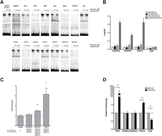 A detailed description of the development of a dual Luciferase gene reporter assay is given in our previous works [6, 7]. Essentially, 2 Kb regulatory regions centered on the Transcription Start Site (TSS) of the Adam19, Traf4, and Map2k1 genes were PCR amplified from mouse genomic DNA (primer sequences used for cloning are listed in Supplementary Table 5) and inserted into pCR4-TOPO shuttle vector through TOPO-TA cloning (Invitrogen). Promoter fragments were further cloned into our destination pCZ-REN_LUC retroviral dual reporter vector using classical restriction sites, such as Bam HI/Hind III for Adam19 and Map2k1 [6] or Sfi I/Pac I (for Traf4, using a modified version of pCZ-REN_LUC reporter with a linker region containing the additional cloning sites). HEK 293T cells were transfected with 350 ng of the reporter vectors along with 250 ng of the expression vector (empty or over-expressing c-Myc) using Lipofectamine 2000 according to the manufacturer’s recommendations (Invitrogen). The c-Myc over-expressing vector MIG-MYC was used to examine the responsiveness of the promoters at low and high c-Myc protein level. Dual luciferase assays were done 24hrs after transfection using commercial reagents (Promega) and a multi-plate reader (Victor 3, Perkin Elmer).
