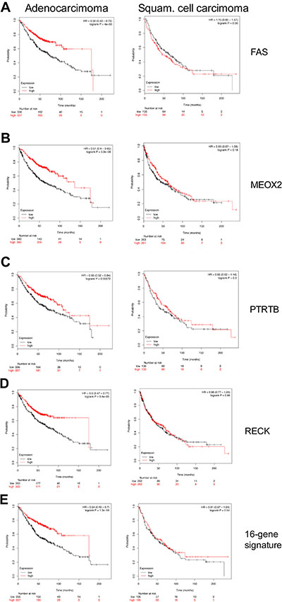Kaplan–Meier curves for significantly regulated genes in c-Myc transgenic tumors were generated with the online tool Kaplan–Meier Plotter (http://kmplot.com/analysis/) [80]. A total of 720 whole genome data sets of lung adeno- and squamous cell carcinoma patients were interrogated and 60 out of 100 regulated genes (14 up- and 46 down-regulated) were significantly associated with survival (Supplementary Table 4). We also generated a gene signature, viz. “13-gene signature” by combining the up-regulated genes over-expressed in murine lung tumors. The combined HR was calculated with Kaplan–Meier Plotter tool by considering the mean expression levels of selected genes. The patients were split in two groups according to the expression levels (high vs. low) and survival for up to 20 years was determined. Note, c-Myc itself is excluded in this signature. Furthermore, a classifier signature was established based on 16 genes that showed the strongest regulation (the average FC in the small, middle and large c-Myc transgenic tumors were about 10-fold) and were significantly associated with poor prognosis when expressed at low levels, i.e. the “16-gene signature” (HR were calculated with the same approach as described above).