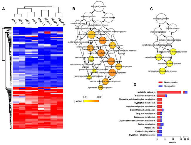 Figure 2: Proteomics data overview. (A), ninety-six differential proteins across the total four replicates in AP and AEAP rats were applied for clustering analysis. Replicates from AP rats and replicates from AEAP rats clustered respectively. Color represents quantitative ratio. (B), the 56 down-regulated proteins in AP or AEAP rats were enriched in 13 GO terms. Color represents the enrichment significance. (C), the 40 up-regulated proteins in AP or AEAP rats were enriched in 4 GO terms. Color represents the enrichment significance. (D), the down- and up-regulated proteins were mapped in KEGG pathways. Pathways including at least 3 mapped proteins were considered.